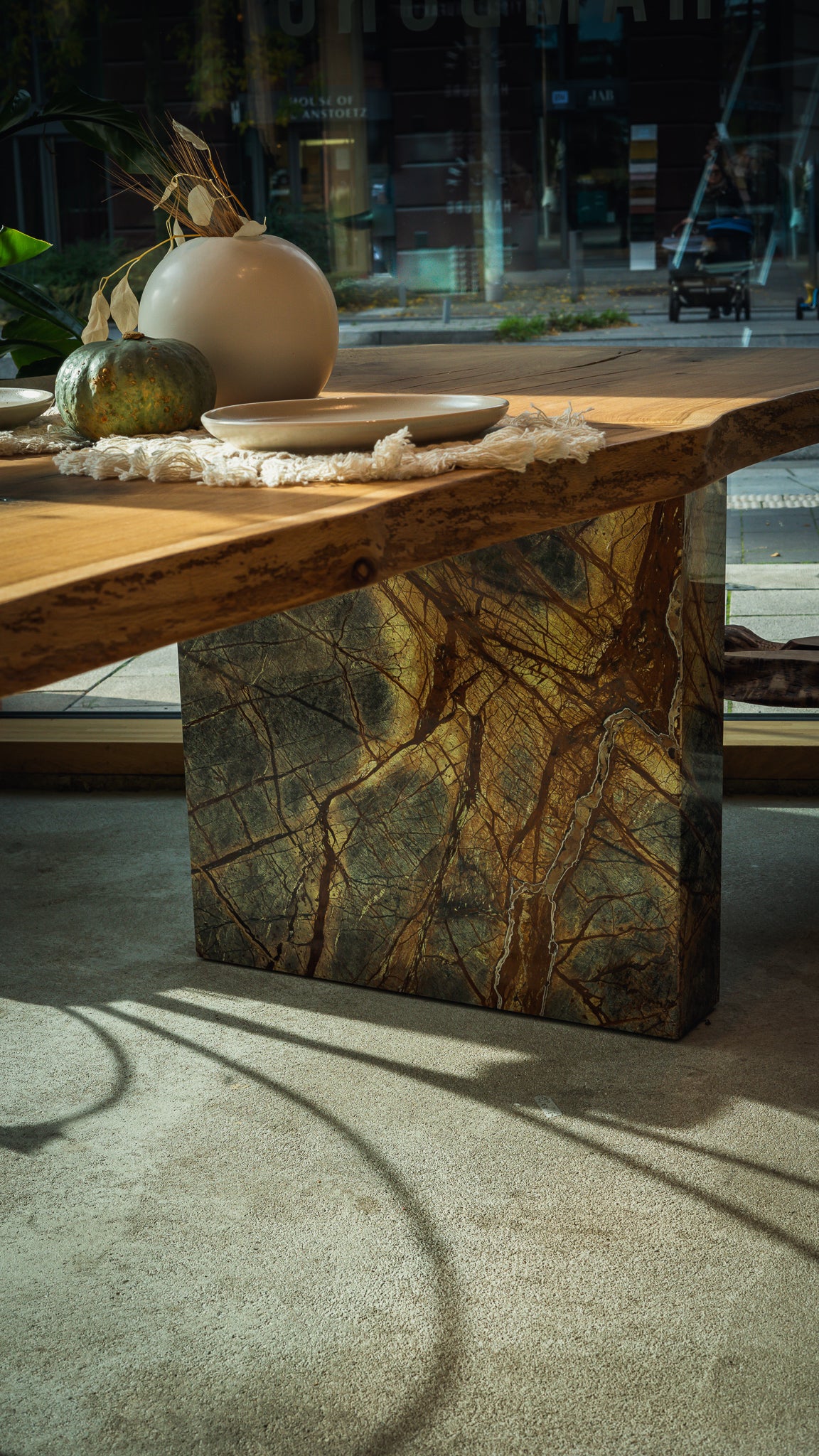 Das Tischgestell besteht aus Naturstein in Wangenform, was dem Tisch eine außergewöhnliche Eleganz verleiht und eine harmonische Verbindung zwischen Holz und Stein schafft.