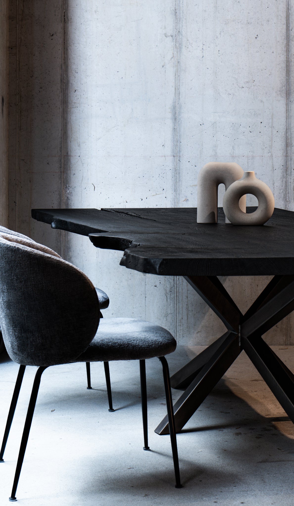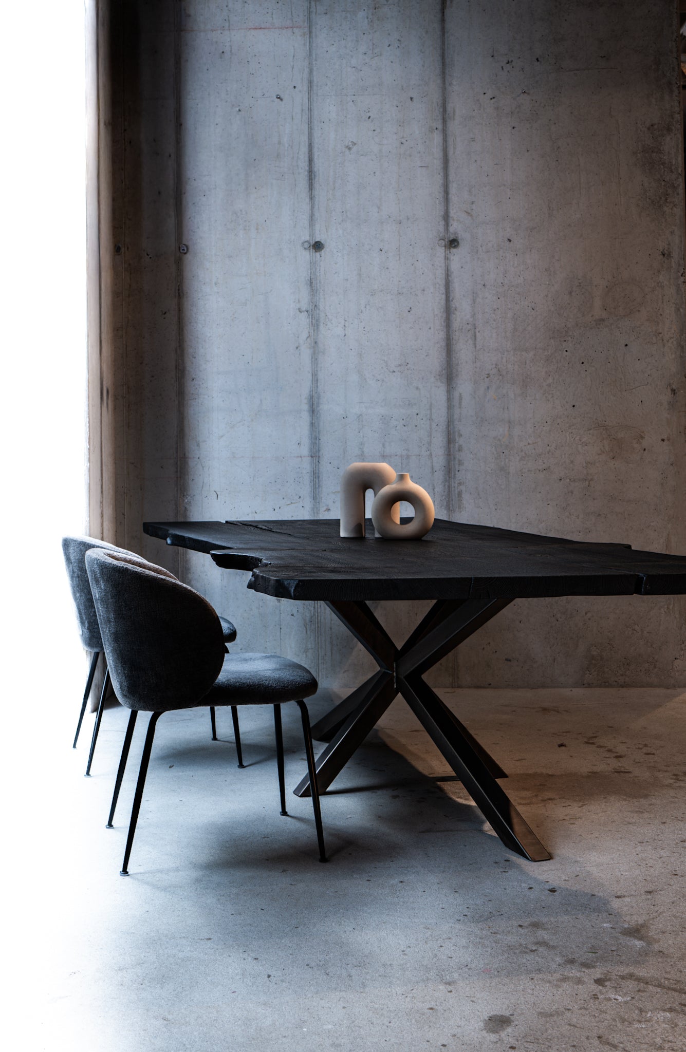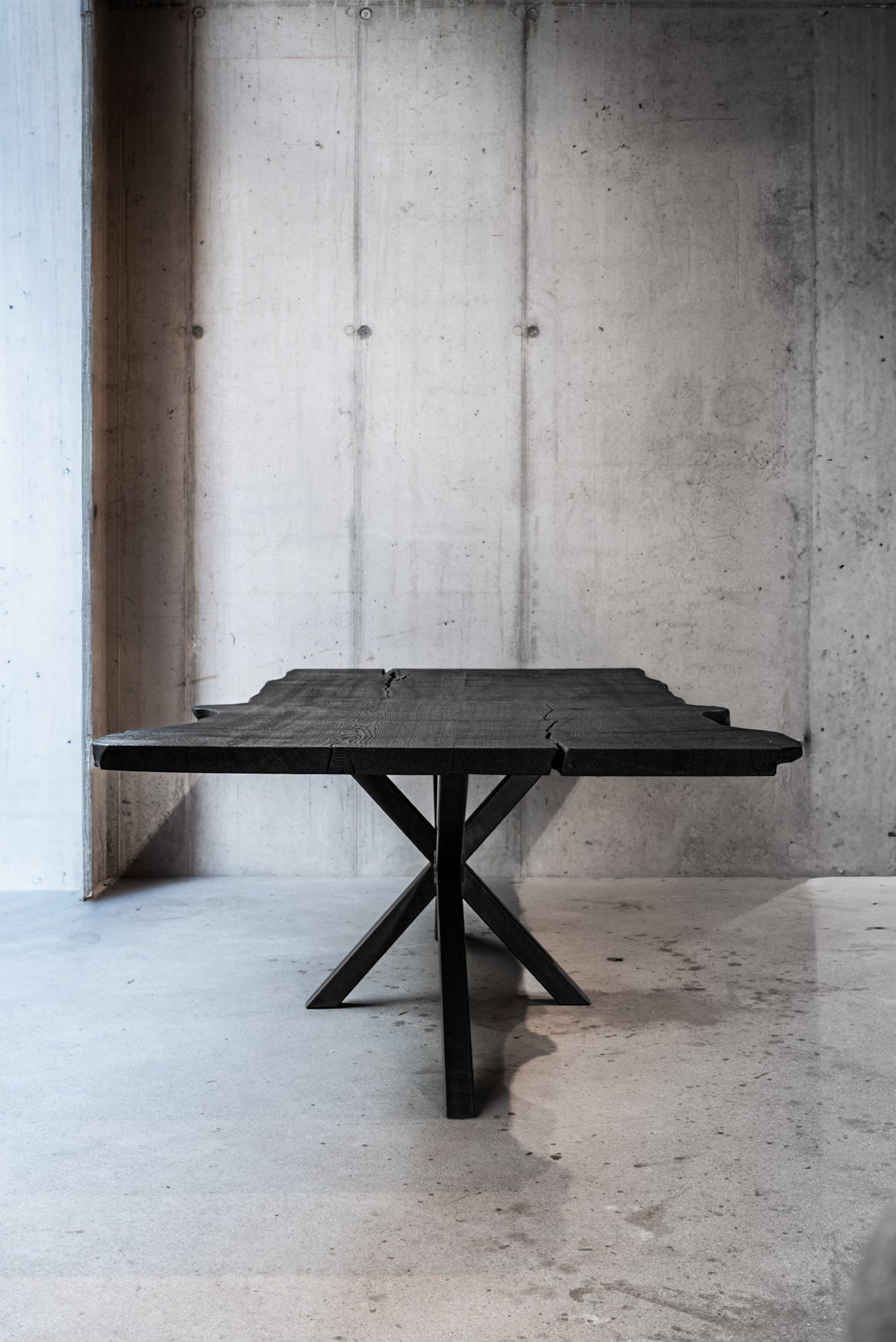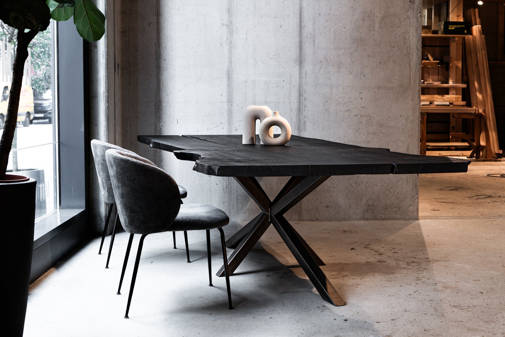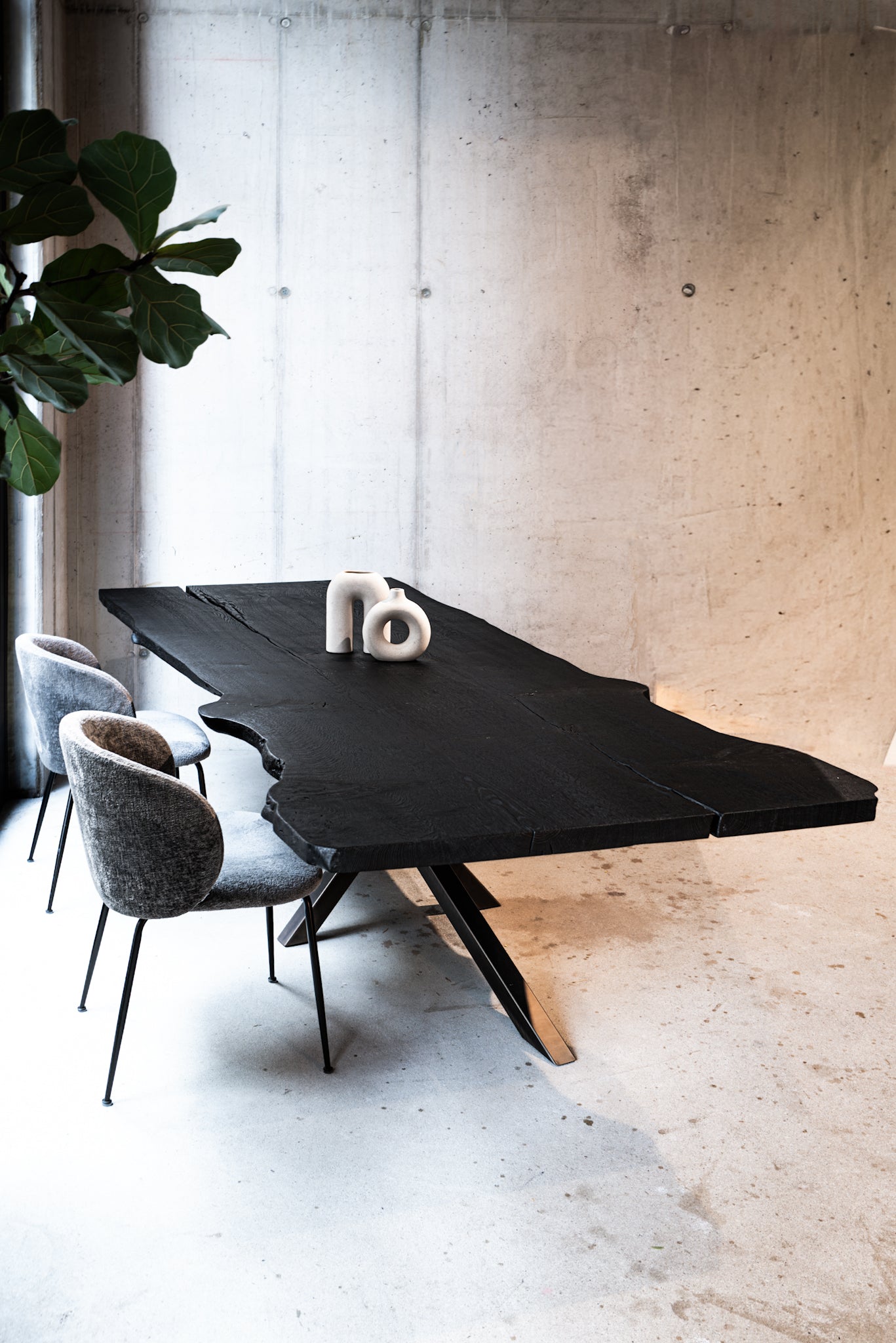 Esstisch aus geköhltem Eichenholz mit natürlicher Baumkante