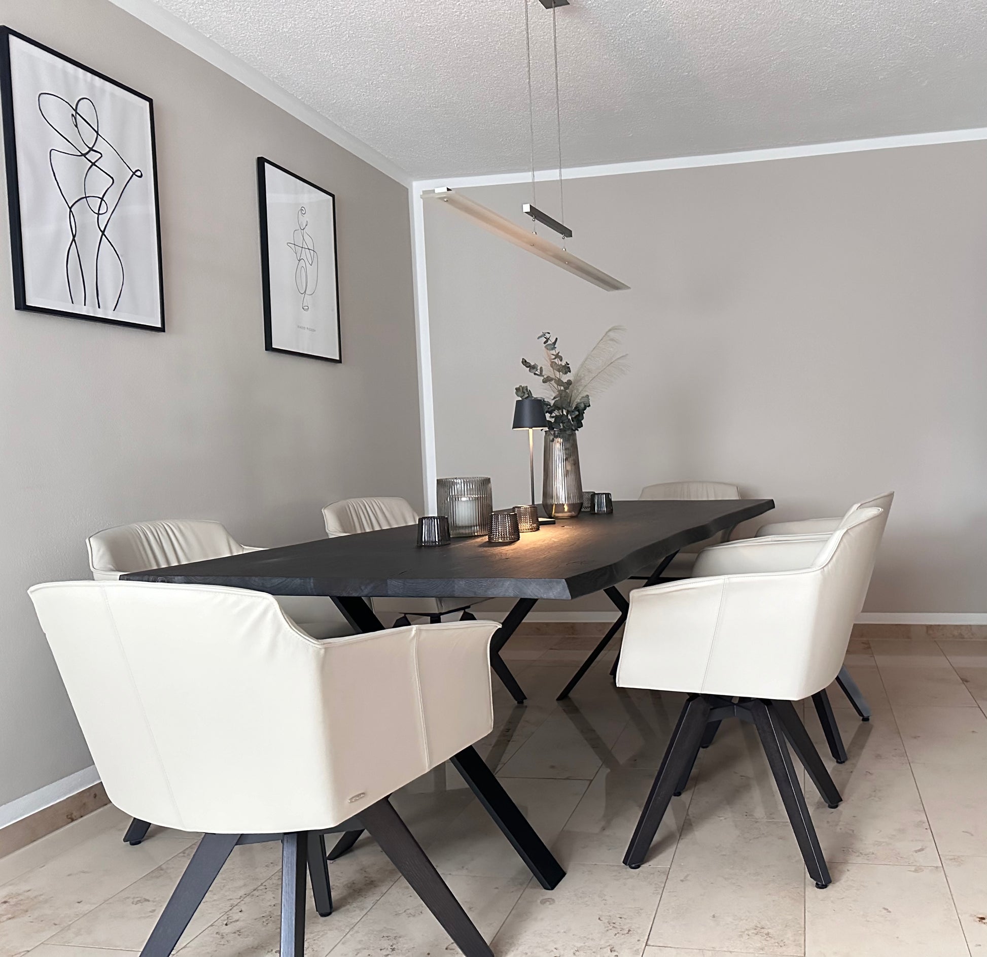 Das schlichte Tischgestell aus Metall sorgt für eine moderne, zeitlose Optik und setzt den besonderen Charakter der geköhlten Tischplatte stilvoll in Szene.