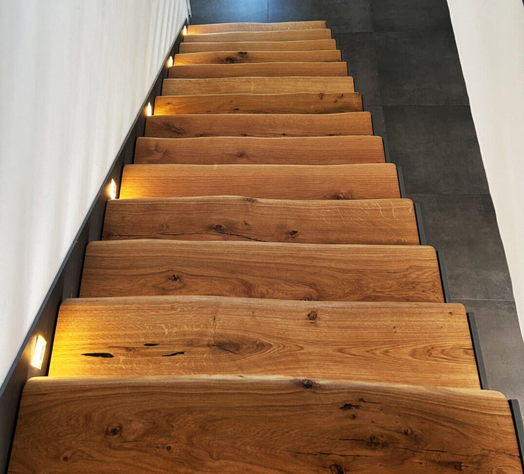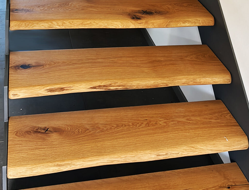 Gefertigt auf Maß, in verschiedenen Stärken, Oberflächen und Kantenkombinationen – für moderne, rustikale oder kreative Treppenkonzepte mit Persönlichkeit.