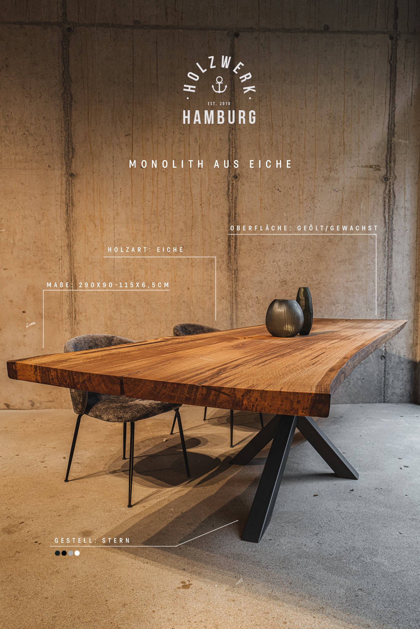 Der Baumtisch aus Eichenholz ist sofort verfügbar und kann in unserer Ausstellung in der Hamburger HafenCity besichtigt werden.
