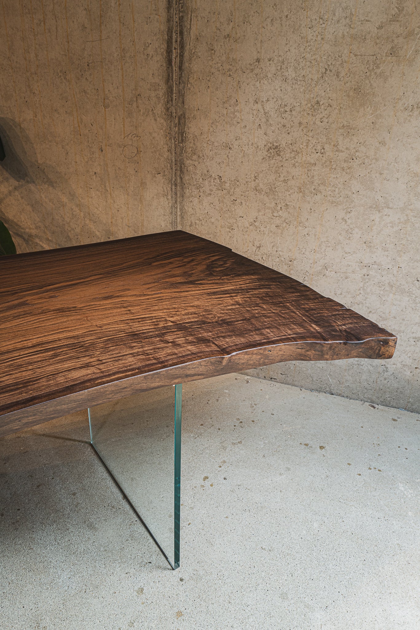 Einzigartiger Unikat-Esstisch aus Nussbaum – unverleimt aus einem Stück mit Glasgestell