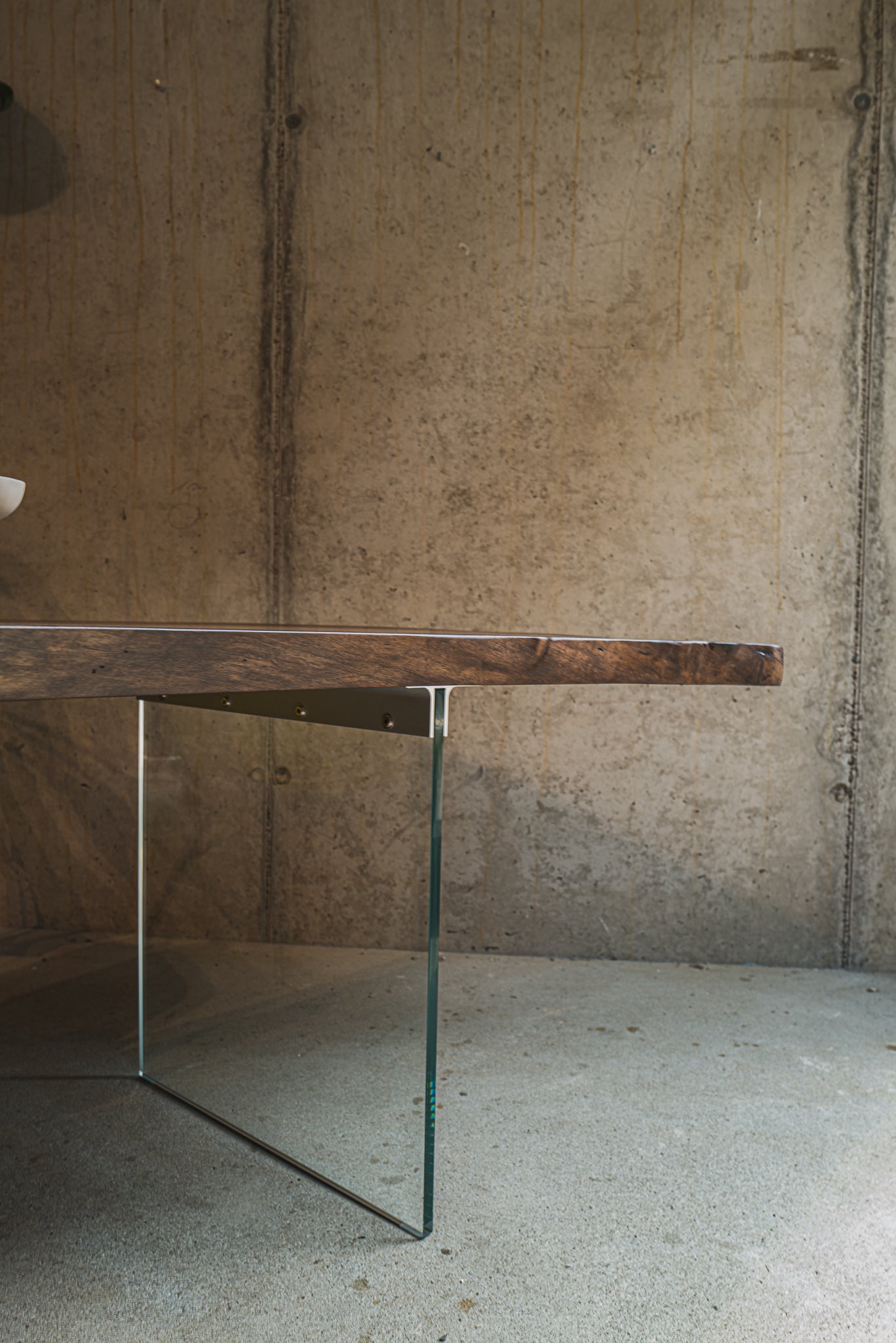 Das Tischgestell aus Glaswangen verleiht dem Tisch eine schwebende Optik und hebt die Schönheit der massiven Nussbaumplatte stilvoll hervor. Auf Wunsch kann das Gestell individuell angepasst oder gegen eine andere Variante ausgetauscht werden.