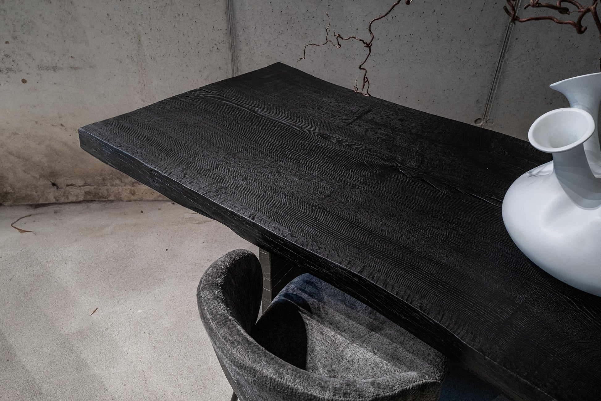 Vorrätiger Unikat Esstisch aus einem Stück Eichenholz mit geköhlter Oberfläche