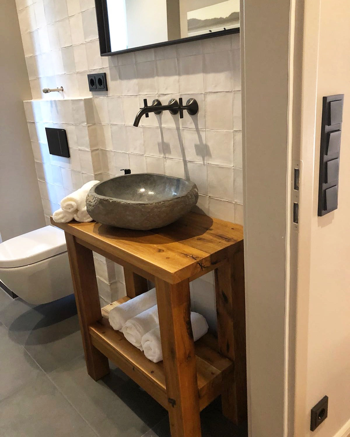 Diese individuelle Waschtischplatte ist die ideale Wahl für ein modernes und natürliches Badezimmerdesign. Die gezeigten Bilder zeigen eine Plattenstärke von 5 cm.