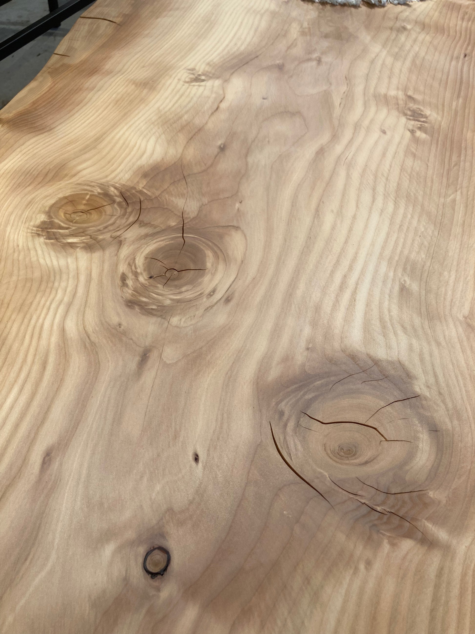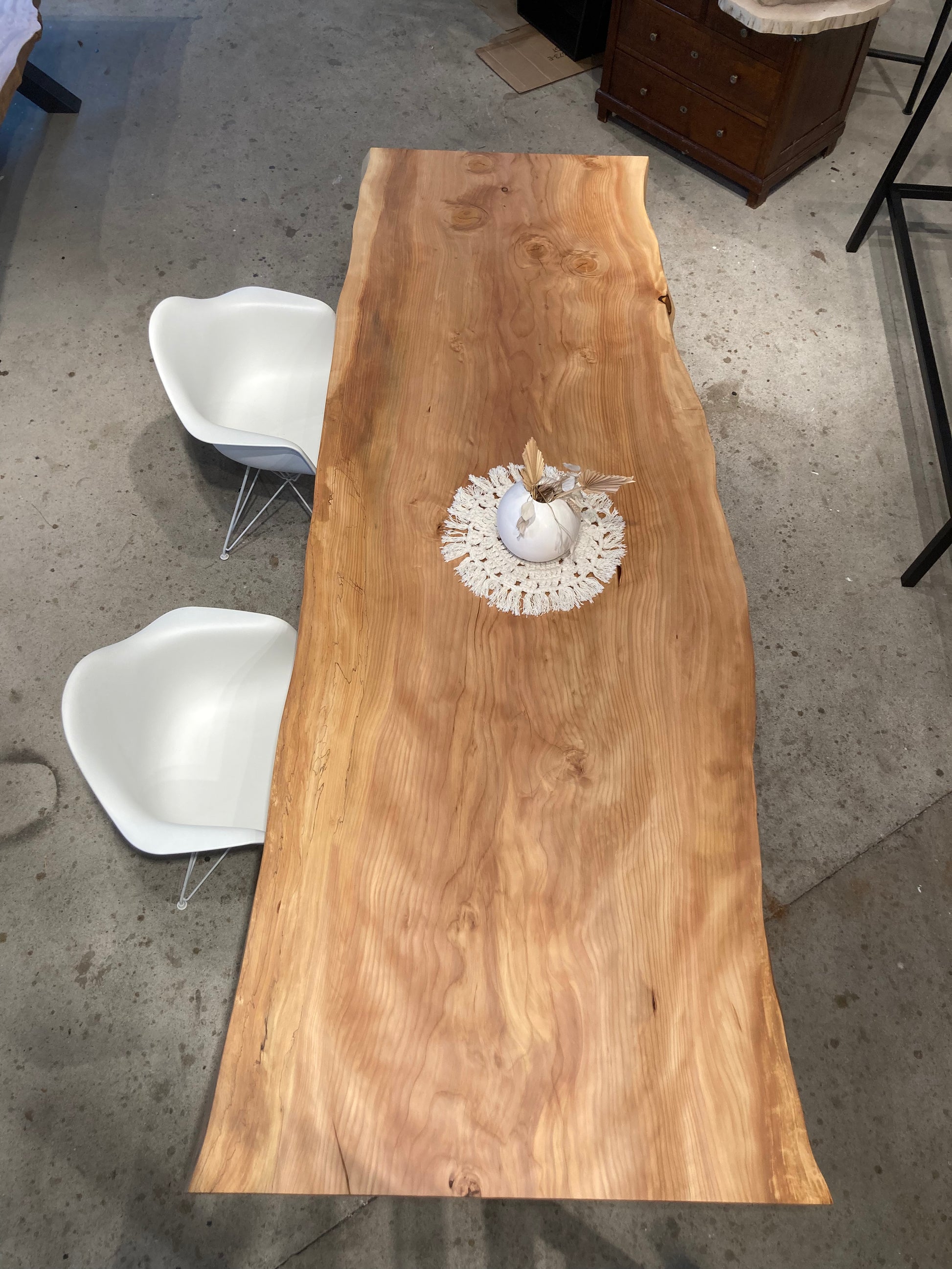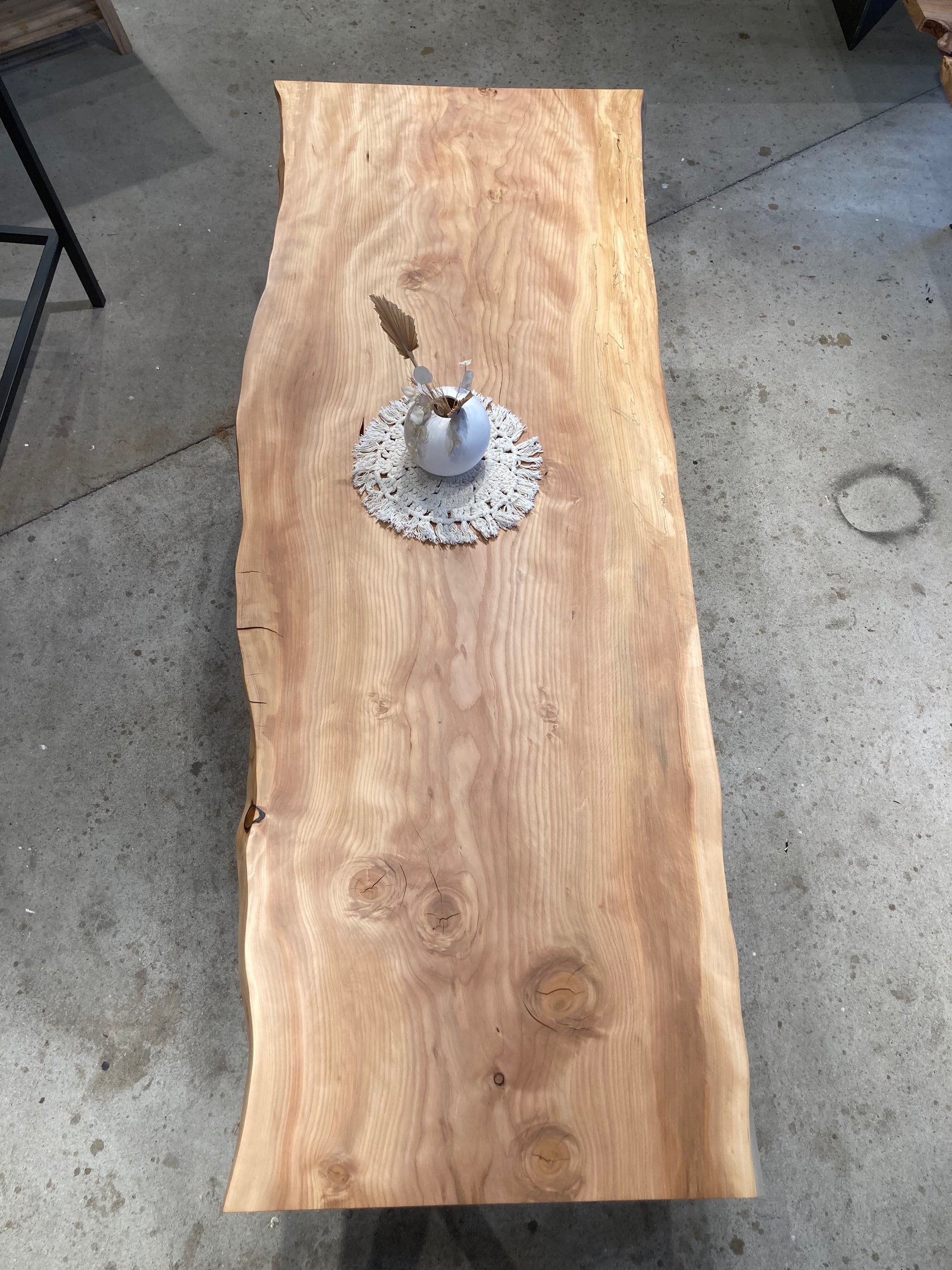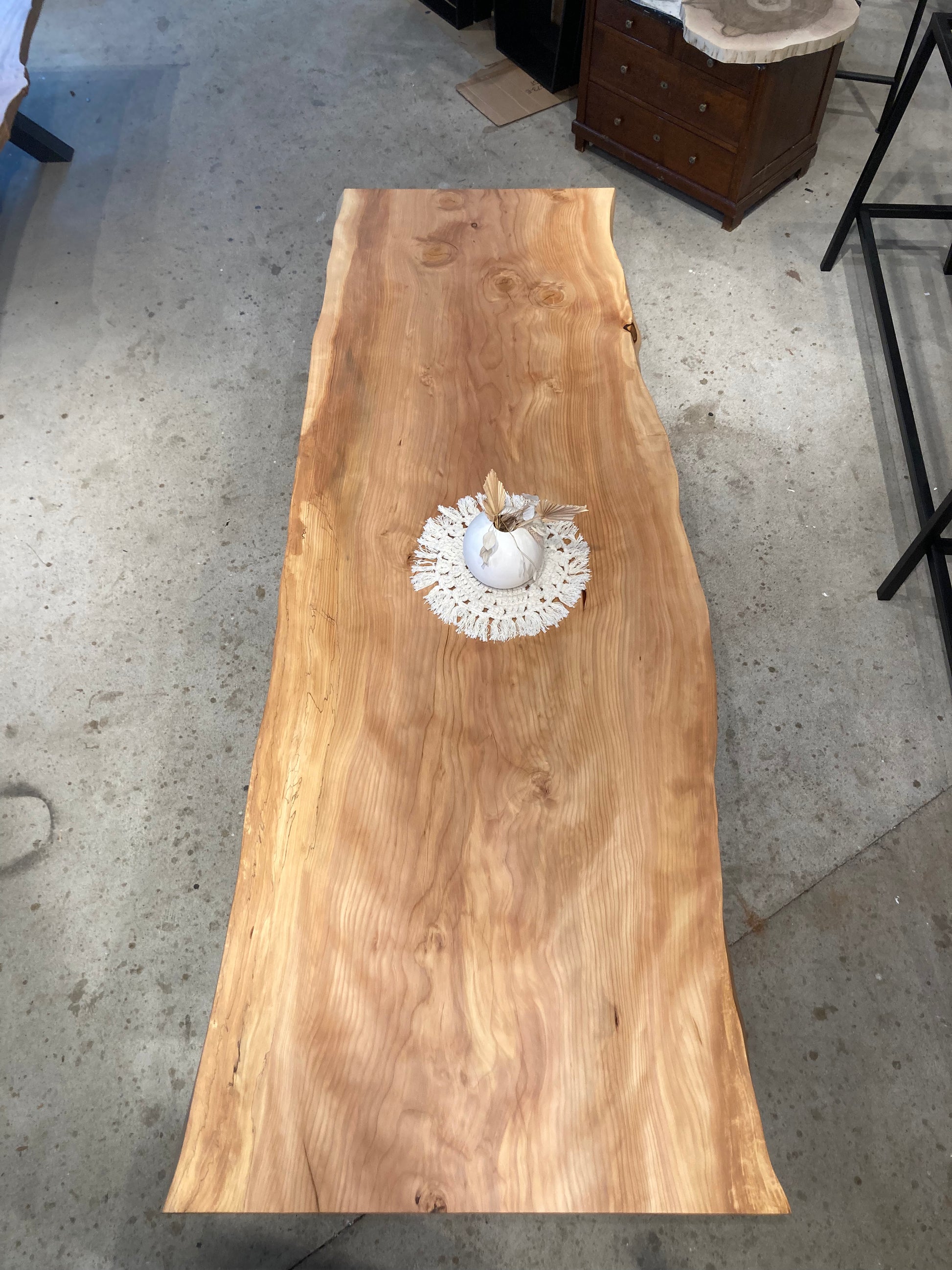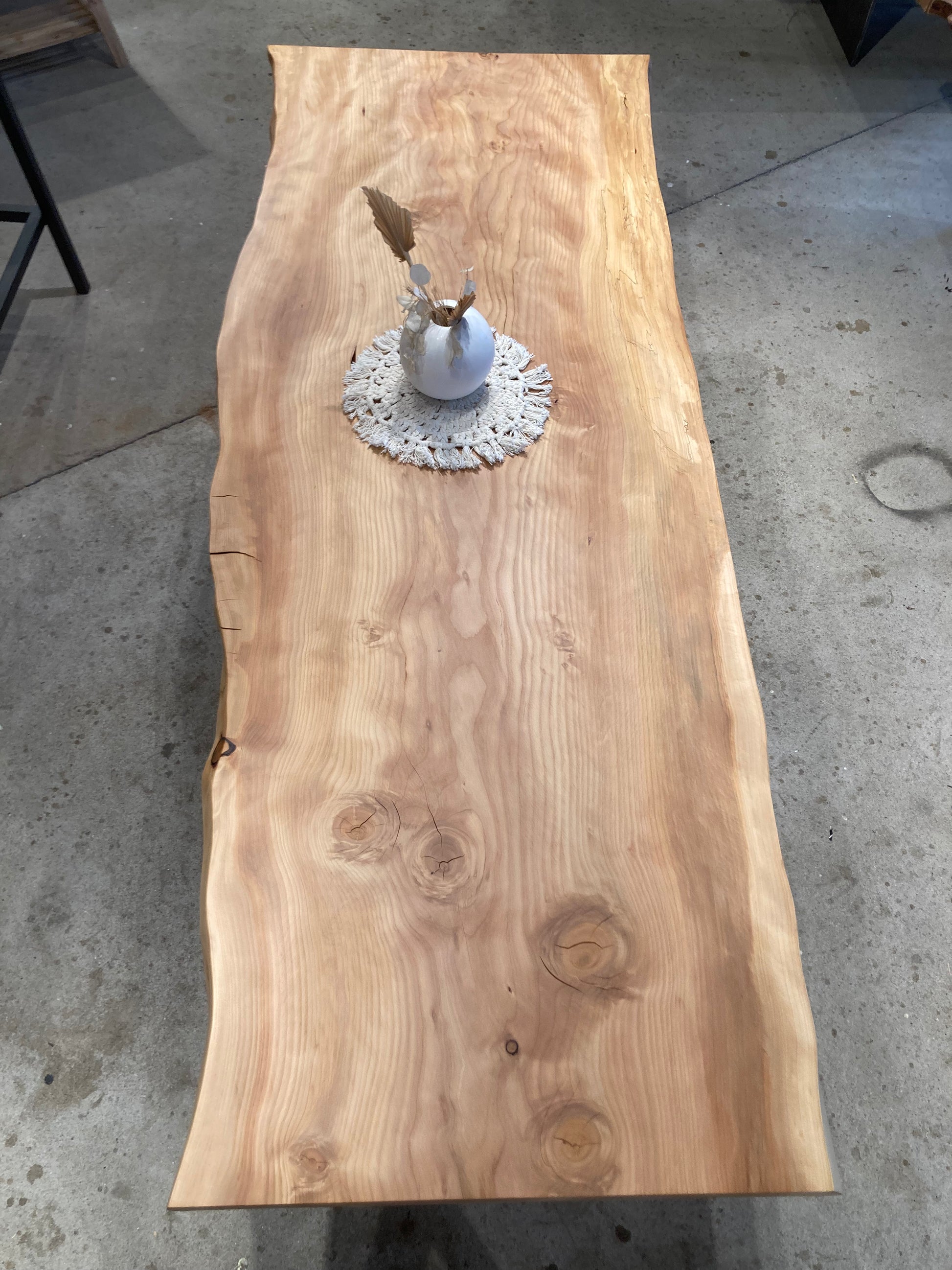 Dieser außergewöhnliche Massivholztisch wurde aus einer einzigen Stammbohle gefertigt und überzeugt durch seine gerade Form mit schmeichelnder Naturkante. Die homogene Maserung und die warme Farbe des Zedernholzes verleihen dem Tisch eine edle Ausstrahlung. Die Oberfläche ist hochwertig bearbeitet und mit Hartwachsöl versiegelt, wodurch sie optimal gegen Flecken und Flüssigkeiten geschützt ist.