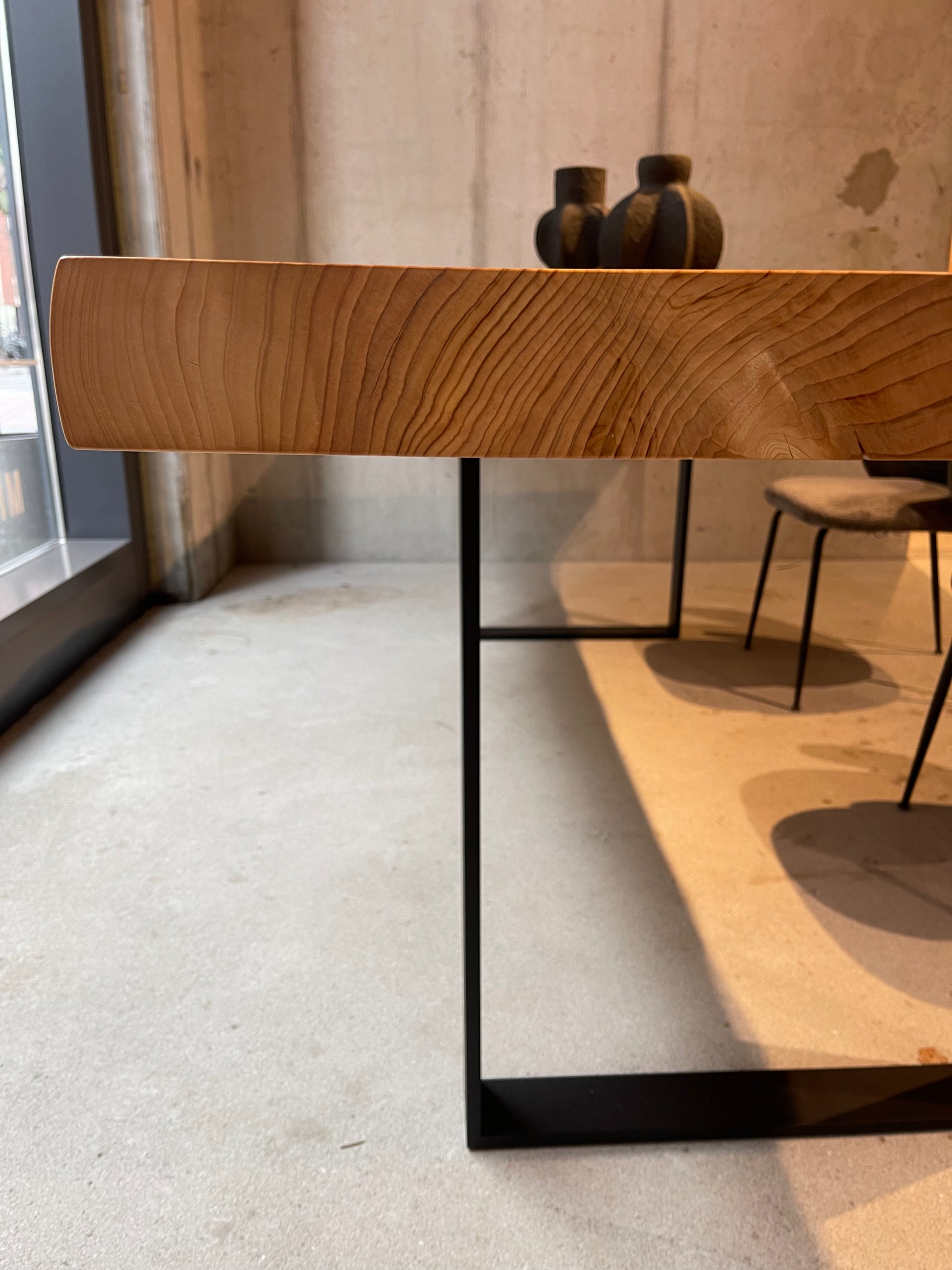 Das zeitlose Gestell aus Stahl in Trapezform ergänzt die massive Holzplatte und sorgt für eine harmonische Balance zwischen Natürlichkeit und modernem Design.